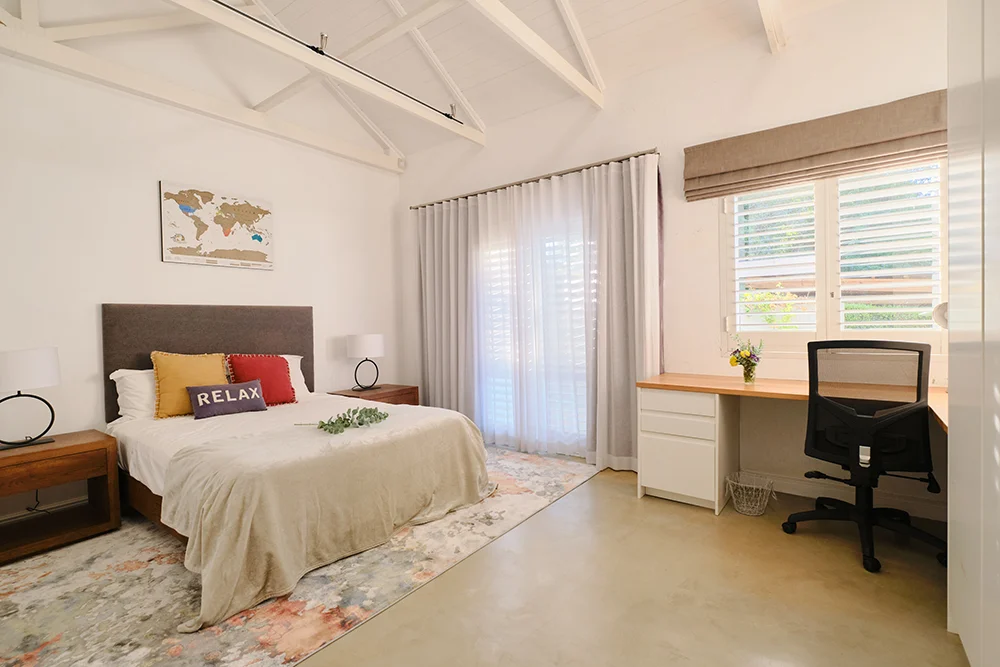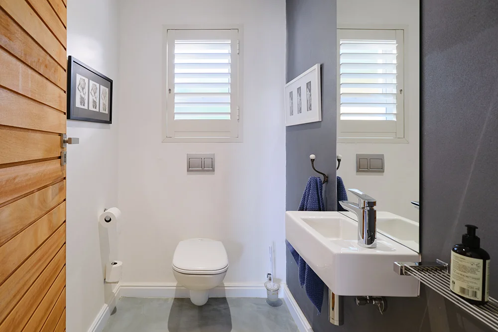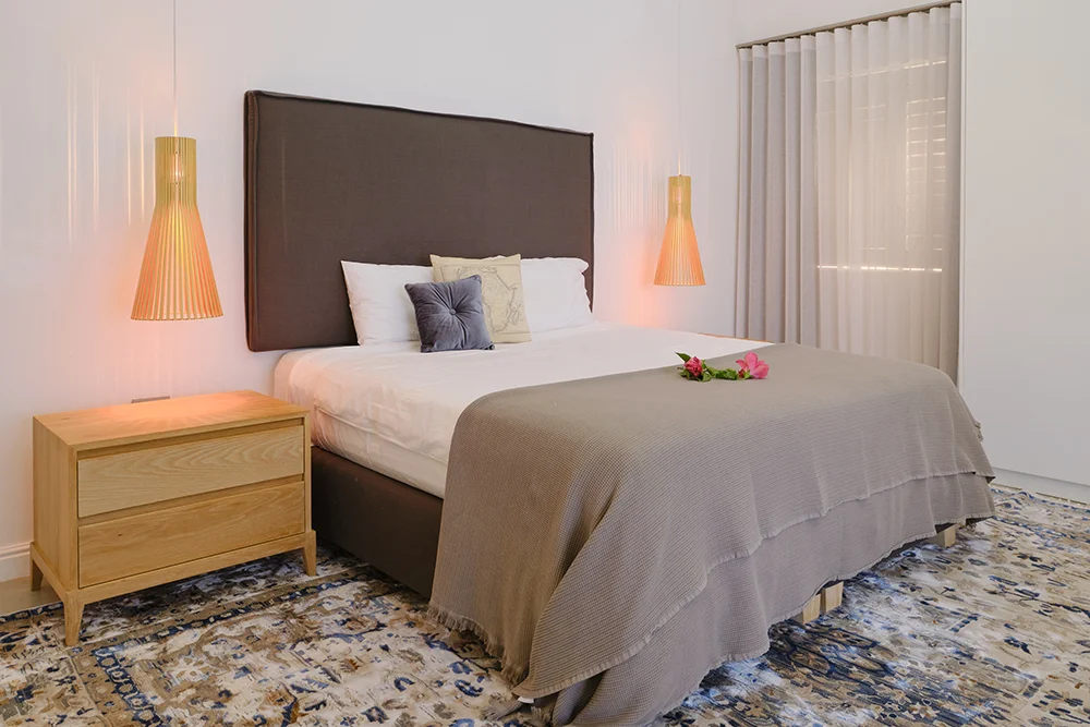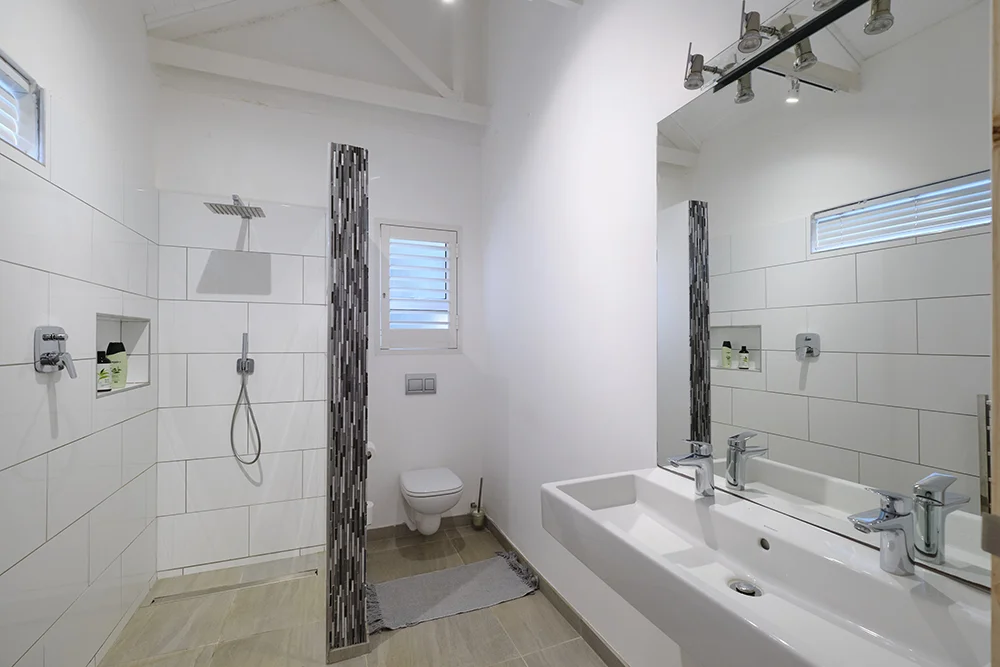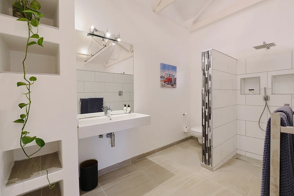 There are two bedrooms, one with a king size bed and full en-suite bathroom and and one with an extra length king size bed (2 singles on request) with a shower only bathroom.